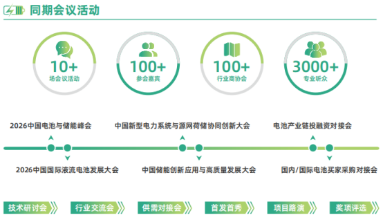 本届展会期间将举行“2026中国国际液流电池发展大会”、“中国储能创新应用与高质量发展大会”和多场平行论坛、新品发布、资源对接、颁奖典礼等配套活动,围绕新型电力系统和新型能源体系建设、新型储能、电池、绿色智算、水风光储氢一体化、绿色能源、充换电等行业热点,邀请电力能源、电池技术领域权威专家进行深入交流,探讨绿色能源新技术、新模式、新业态,助力能源产业数字化、智能化、绿色化转型,实现高质量发展。